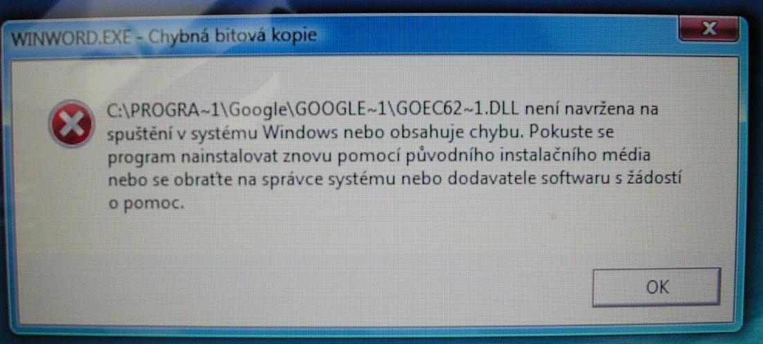 Prikladam v priloze obrazek te hlasky, a to konkretne pri spusteni Wordu (viz info na liste na hlasce). Absolutne stejna hlaska se objevuje na vsechno ostatni, jen samozrejme s jinym nazvem programu, od rundll32.exe a dalsich 20 po startu, az po jakykoliv program, ktery v systemu potom spustim (viz v priloze zrovna Word).