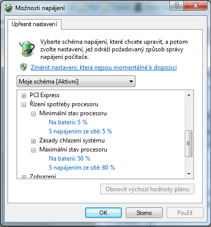 Tak bud nikdo nezná odpověd nebo jsem to podal špatně a tak to zkusím říct jinak. Windows disponuje funkcí, alespon co se notebooků týče (u PC nevím) "Možnosti napájení," kde se dají nastavit různé úsporné režimy pro větší výdrž baterie. Pár položek se týká také spotřeby procesoru (viz. přiložený obrázek). Na mém notebooku je procesor Turion 64 X2 2GHz, který disponuje tzv. PowerNow! technologí. Ta umožňuje podtaktování procesoru při nízkém vytížení nebo přehřívání a šetří tak baterii a větrák tolik nehlučí. Tento procesor má tři frekvence, na kterých běží - 2GHz (plný výkon - 100 - 81%), 1,6GHz (střední výkon - 80 - 41%) a 800MHz (nízký výkon - 40 - 1%). Na plném výkonu ale větrák až nepříjemně hlasitě hučí, proto chci nastavit výkon pouze na střední. To není problém, co se pohybování v OS týče. Problém je ale když zapnu například nějakou hru, která jde spustit pouze ve fullscreenu (když se spustí v okně, tak je vše v pořádku, bohužel windowed nastavením nedisponují všechny hry:/). To se totiž všechna nastavení hodí na maximální výkon a já si pak pořádně nemohu hru užít (to platí i pro hry, které by bez problému běžely i na nízký výkon, jako je třeba HoMaM 4). Co potřebuju je, aby se nějak dalo nastavit výkon procesoru i pro fullscreen aplikace na těch zmíněných 80% či méně.