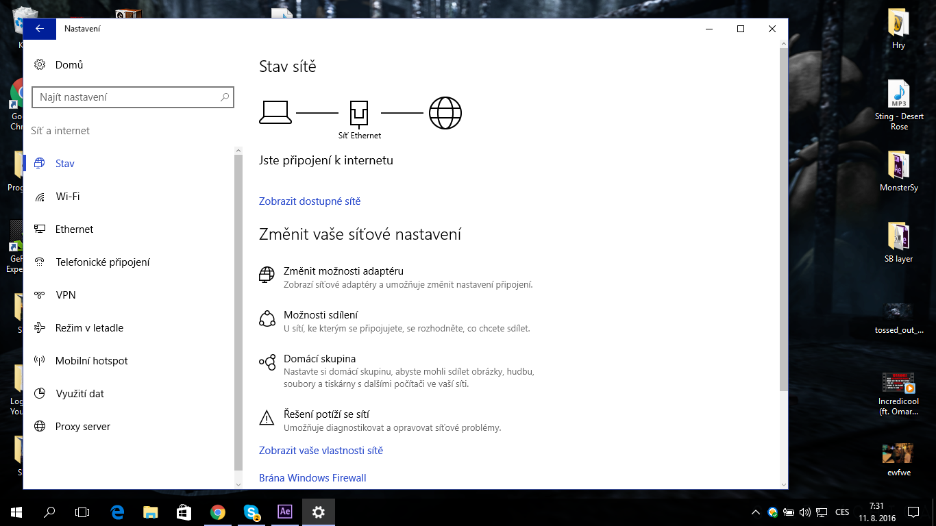 Tak dostala jsem se do záložky síť a internet. V tomto proběhla docela obrovská změna. Najdeme zde pár novinek. Jako je například když jsem připojená na kabelu ukazuje se obří kabel s připojením. což na starší verzi najdete jen Wi-Fi. A stav tam vůbec není. taky jsem si nemohla povšimnout mobilního hotspotu . Vím že tohle využívá normálně Mobil. Ale aby to bylo ve windows ? Docela mi de hlava z téhle věci vedle. Jinak opět přidány ikonky k různým záložkám.