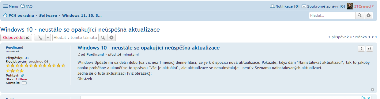 ad 2. - Témata jsem samozřejmě před napsáním mého dotazu prohledal, použil jsem filtr "aktualizace Windows" - výsledkem bylo něco přes 400 výsledků na 12 stránkách... Děkuji za uvedené vlákno,