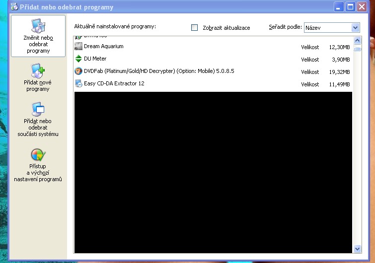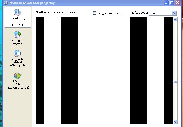 Stalo se mi, že jsem otevřel v ovládacích panelech přidat odebrat programy a všechny tam jsou, ale tabulka je rozdělaná a objeví se tam černá plocha a potom pruhovaná a potom zbytek instalovaných programů. Posílám picpic v příloze. Mám Windows XP. Děkuji za radu, jak to opravit. Abrit