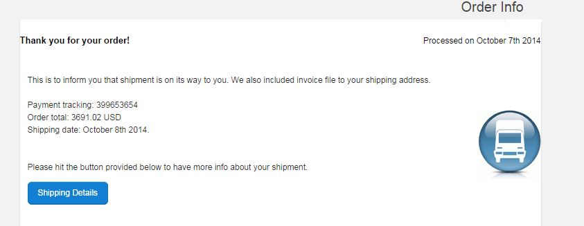 dneska mi přišel e-mail, který sděluje, že moje „objednávka“ je na cestě ke mně. Problém je, že já si nic neobjednal, zvlášť věc za 74k Kč. Mail je hned pochybný v tom, že zde nejsou žádné informace o adrese atp... a odkaz na detail objednávky by měl být nějaký soubor na DropBoxu, což jsem okamžitě shrnul jako na vir. Mě jen zajímá, jestli někdo dostal někdy podobný email?