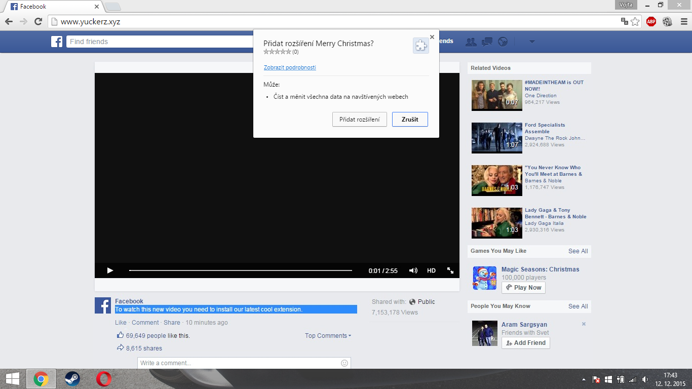 Zdravím.Na FB mi vyskočilo upozornění od spolužáka kde mě označil na videu. Při pokusu o zhlédnutí videa jsem klikl na přidat rozšíření (viz screen). Chci rozšíření odendat ale když jdu do nastavení a kliknu na položku rozžíření vyskočí okno s rozšířeními ale ihned se vypne. Neví někdo co s tím??