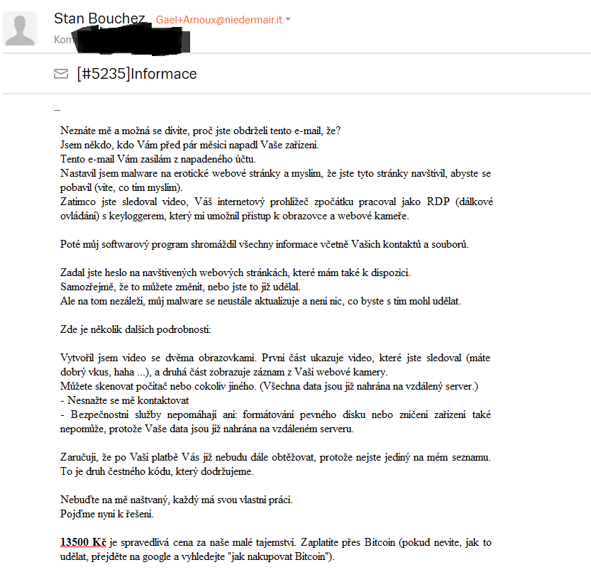 Také mi to samé nebo něco podobného nedávno přišlo a samozřejmě neberu to vážně. Tyto nebo podobné e-maily se šíří už nějakou delší dobu a divím se, že proti tomu se už něco neudělalo a nezastavilo se to. To snad policie má málo prostředků na to aby s tím něco udělali nebo nemá dostatečné odborníky na to aby toho nebo ty (pokud jich je více) lumpy vypátrali a zastavili je v tom? Je mi jasné, že pachatelé působí asi někde ze zahraničí a proto je tu kromě policie ČR ještě i nějaký Europol a Interpol nebo jak se to vše jmenuje. Ty peníze se mají posílat na nějaký bitcoinový účet a ten snad anonymní není a nebo by šlo snad vysledovat kde ty Bitcoiny odtamtud putují dál. Asi je to mnohem složitější než si mnozí myslíme.