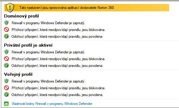 Trochu mně mate formulace ve žlutém záhlaví tabulky. Znamená to, a) že aplikace NORTON 360 nastavila Defender a pak mu v tomto nastavení svěřila funkci firewalu, nebo b) že Norton 360 převzal funkci firewallu sevšímvšudy? Doufám, že b) je správně.