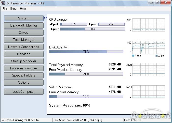 SysResources Manager je systémový nástroj pro sledování aktuálního stavu důležitých systémových zdrojů, jako je využití CPU, RAM a virtuální RAM dostupnosti, pevný disk zdraví a výkonnost, aktivní procesy a přístup k internetu, monitorování šířky pásma přenosů (Download-upload rychlost), Služby, Programy po spuštění.