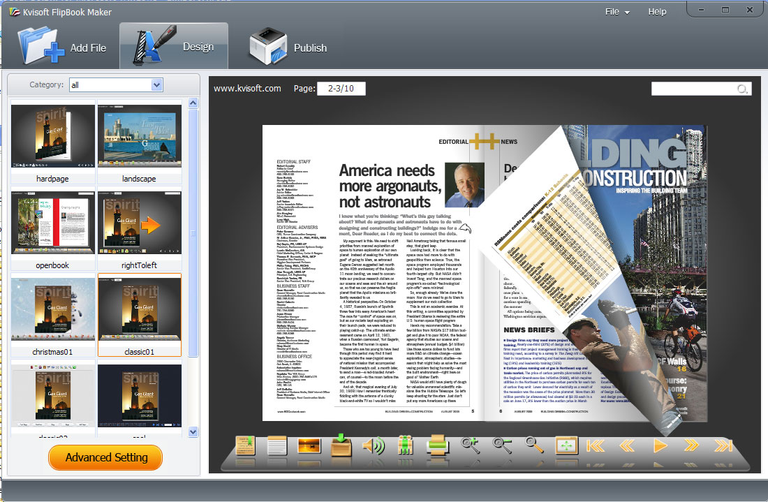Kvisoft Flipbook Maker poskytuje snadno ovladatelný způsob, jak převést dokumenty PDF do 3D úžasných Flash knih s obracejícími se stránkami a animační efekty bez znalosti programování.