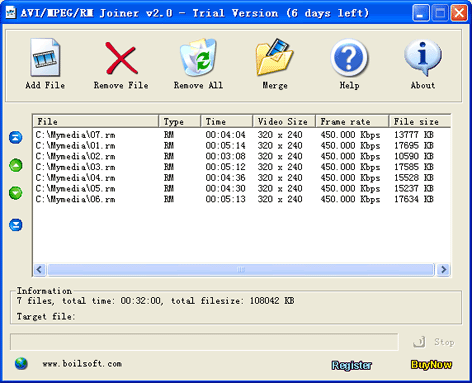 Boilsoft Video Joiner umožňuje snadno spojit více video souborů do jednoho většího. Soubory jsou spojovány přímo, bez opakované komprese a ztráty kvality. Podporuje formáty AVI, MPEG(MPG), RM(Real Media), ASF/WMV, 3GP a MP4. Snadná je změna uspořádání jednotlivých sekvencí.