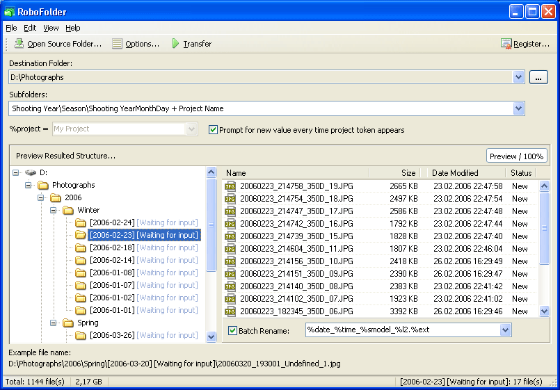 RoboFolder slouží k získání lepšího přehledu ve sbírce digitálních fotografií. Program například umožňuje hromadně změnit jména souborů a složek s fotografiemi, provádět barevnou korekci nebo rotaci snímků, oddělit videosekvence od fotografií atd.
