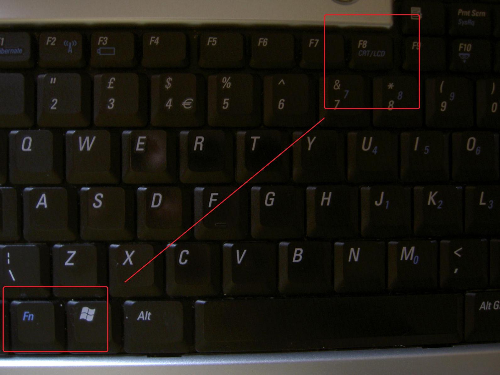 Na klavesnici je klavesa oznacene jako CRT/LCD - je to vedlejsi klavesa (napriklad: na klavese F8 bude jeste CRT/LCD), a aby jsi zvolila tuto volbu musis predtim zmackout klavesu Fn/a nasledne+F8, tj. zmackes F8, ale klavesa vykonna cinnost jak jsi ji urcila klavesou Fn).