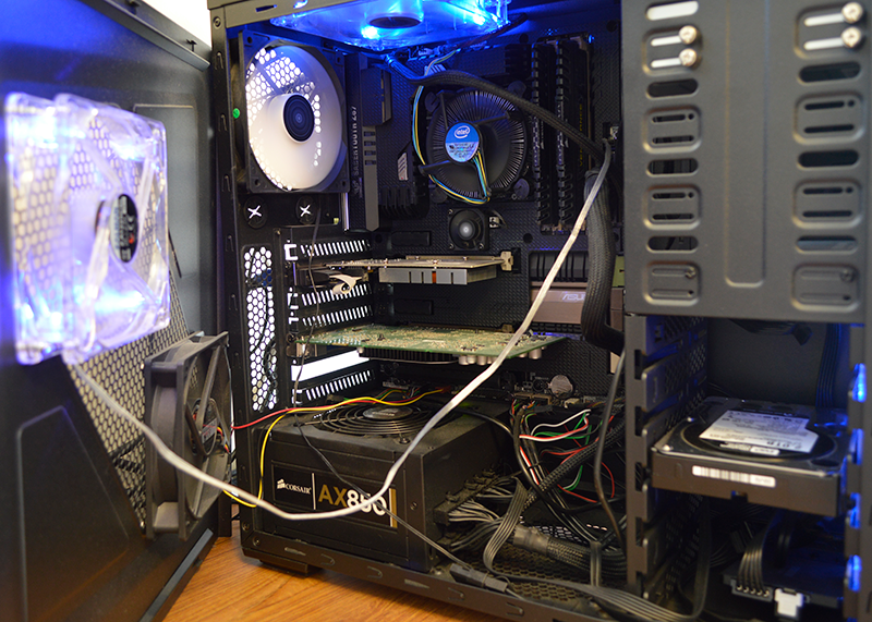 Je tam Sabertooth za 5400 Kč, pak nějaká levná pasivně chlazená grafika, pod ní je nejspíš 6800GT, BOX chladič, 4 různé větráky, je tam bordel...