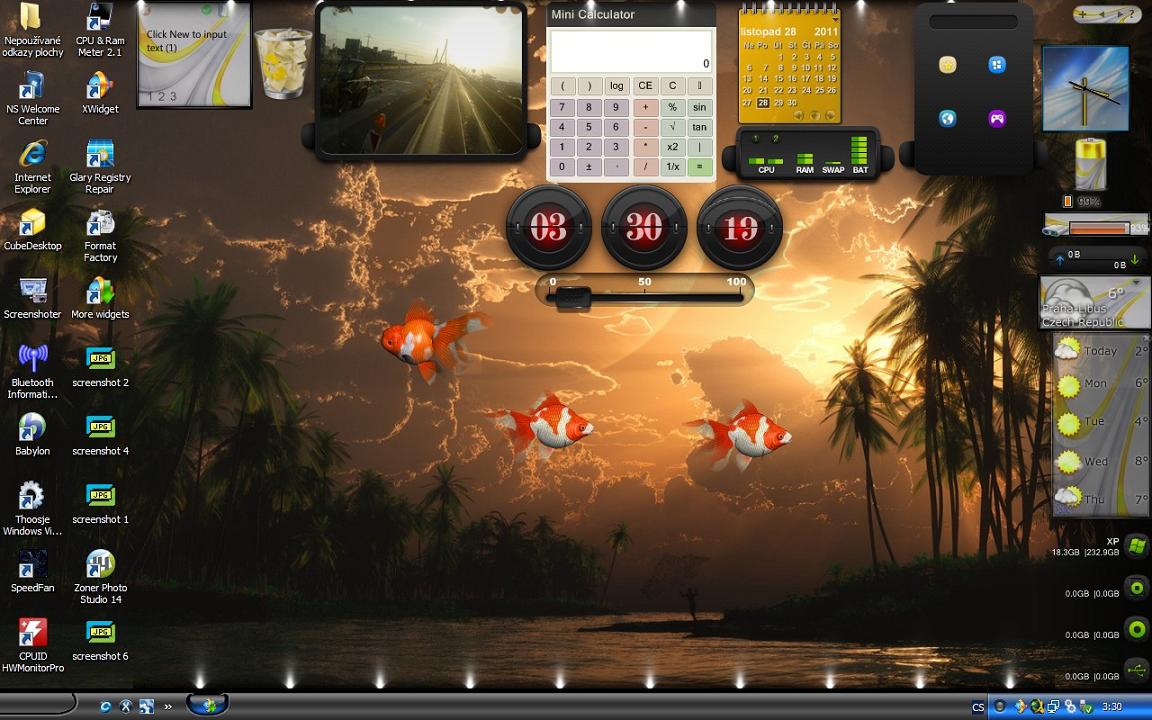 Našel jsem jsem skvělou aplikaci XWidget,pomocí ní si můžete zkrášlit plochu.Nabízí spousty možností,jako jsou hodiny,nebo měřič CPU atd.,ale taky si můžete tyto věcičky vytvořit sami v této aplikaci.