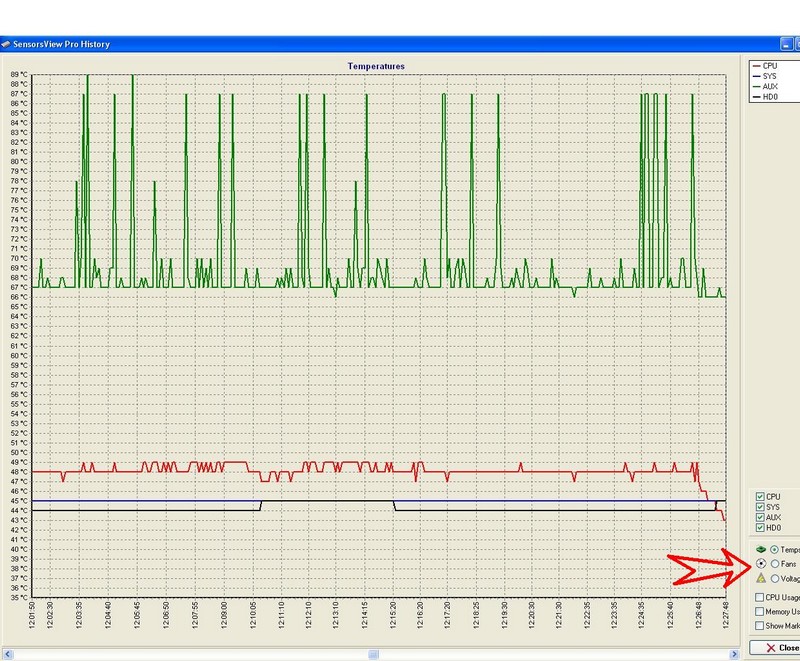 Přemýšlel jsi také nad možností, že čidlo neukazuje správně?(resp.:zkoušel jsi třeba rukou teplotu vzduchu, který jde z PC ven?)