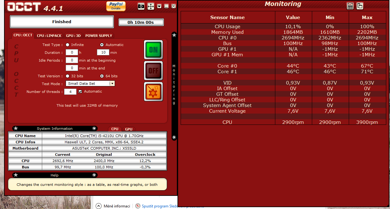 Core0 67°C Core1 71°C asi tak bylo na těch 10 min