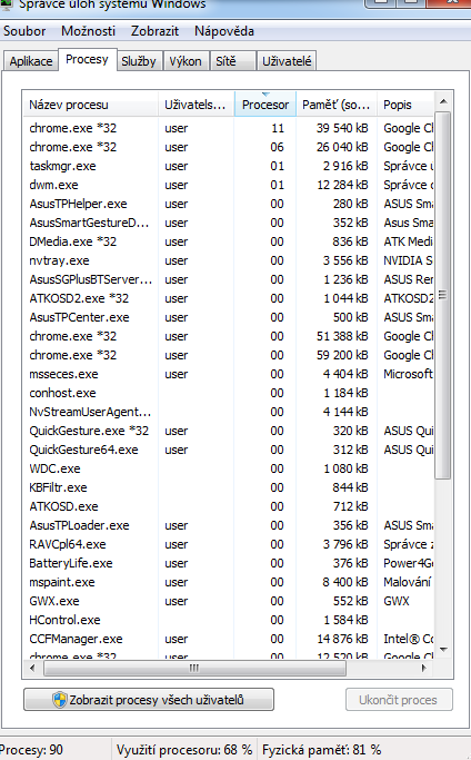 Mám problém s vytížením procesoru.Po zapnutí PC je využití procesorů na 65-90% a to jsem jenom na chromu.Příjde mi, že to začalo z ničeho nic, dříve jsem hrával LoL na 90-110 FPS a teď po zapnutí hry mám 50 a do cca 2min. klidně i 25 FPS.Prosím o rady v tomhle se moc nevyznám..Myslím si, že to bude nějaký vir nebo něco takového.Vím, že NTB už je celkem starý a nic moc, ale před pár dny možná týdny všechno jelo v pořádku.Díky za rady :)