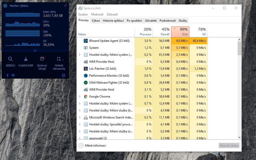 Takže počítač jsem odnesl do servisu ve městě, počítač zkontroloval a všechno běží jak má. Harddisk měl akorát špatné teplotní čidlo, nicméně byl starý, tak jsem zakoupil nový. Ten jsem dal do počítače, nainstaloval Windows 10, ostatní potřebný software a opět se mi seká hra. Nyní dělám běžné věci na počítači a začalo se mi to sekat znovu a i tento nový harddisk píše 100%. Přikládám screenshot.