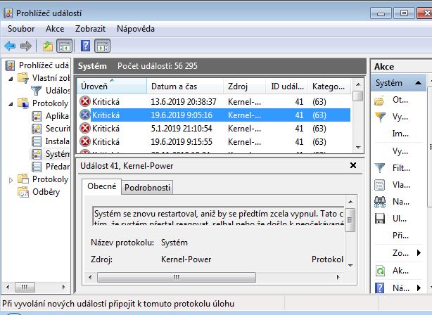 dnes ráno jsem spustil PC a po cca 2 minutách provozu se samo restartovalo. Pak to stejné udělalo po chvíli ještě 2x. Teď píši ve "zjednodušeném režimu" (jinak PC nefungoval)- win 7 "s obrazovkou o nízkém rozlišení". Prošel jsem si zde diskuze jak postupovat.. Teploty HW by měly být ok, provedena win diagnostika paměti, také v pořádku. V Prohlížeči událostí jsem našel chyby, které souhlasí s časem samovolného restartování PC. Přikládám screen. Níže přidám data co se mi zatím podařilo zjistit. Moc se v tom nevyznám.