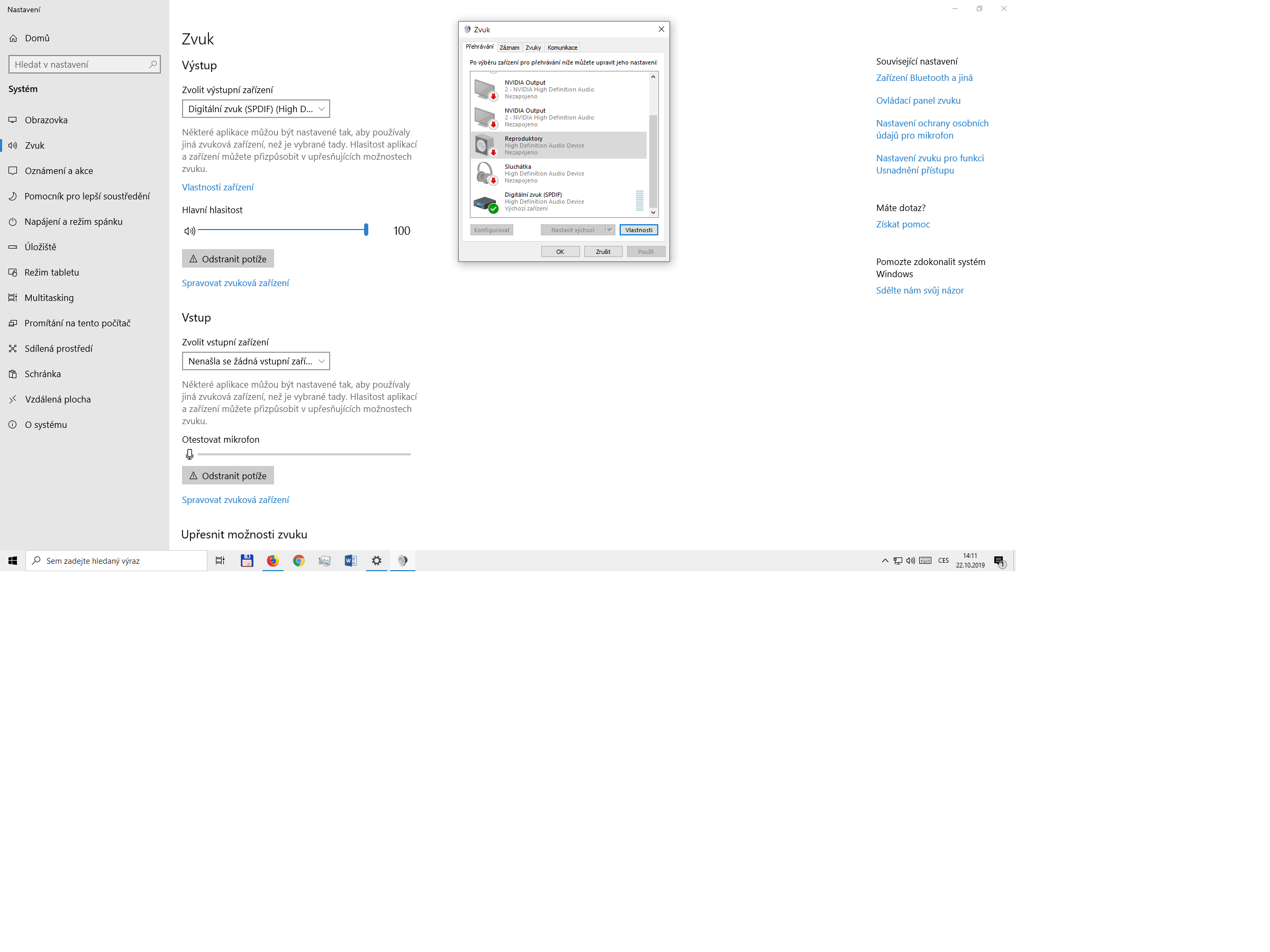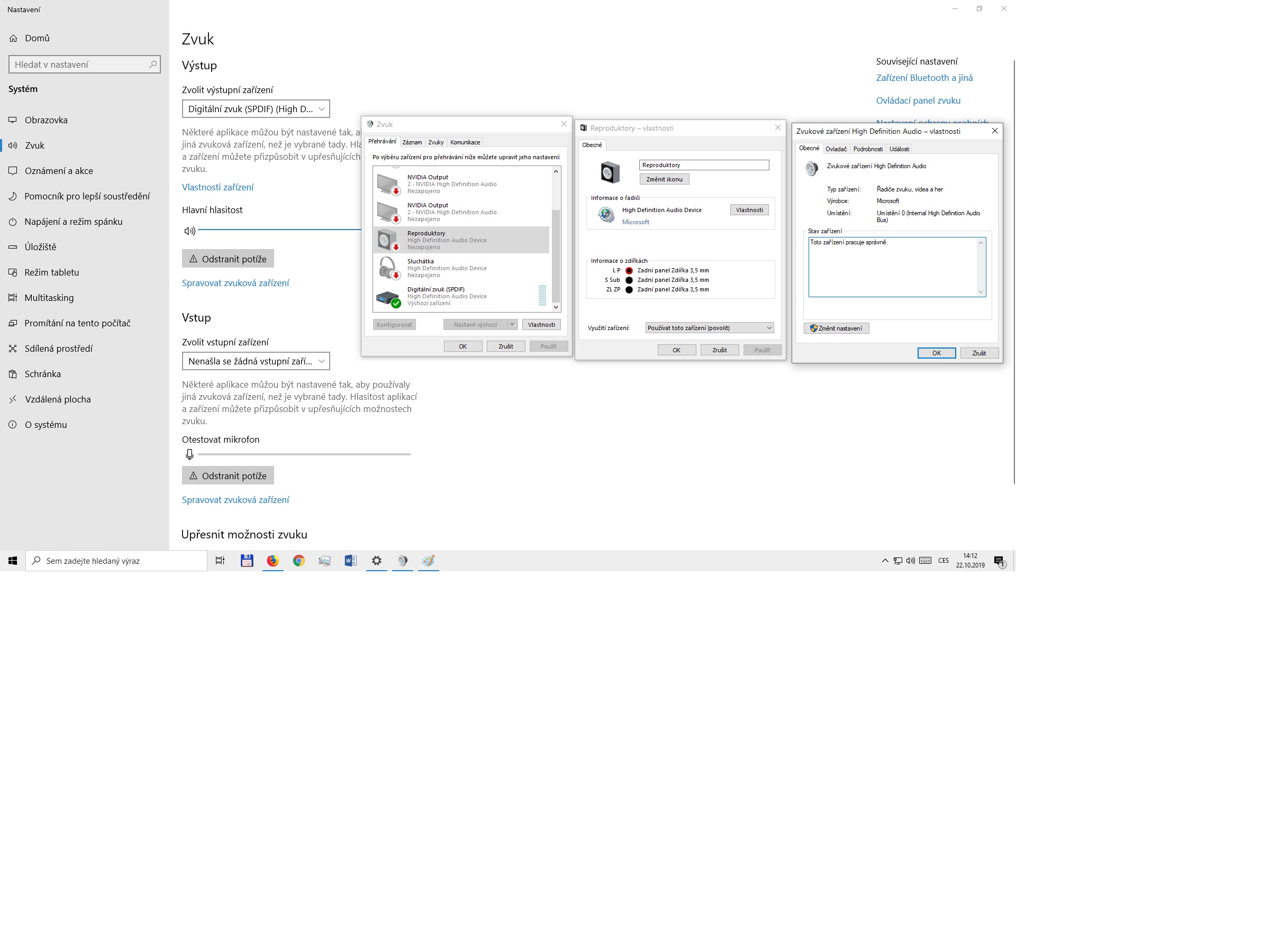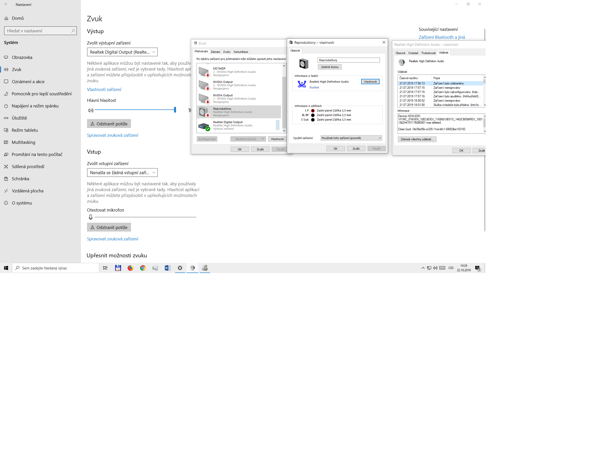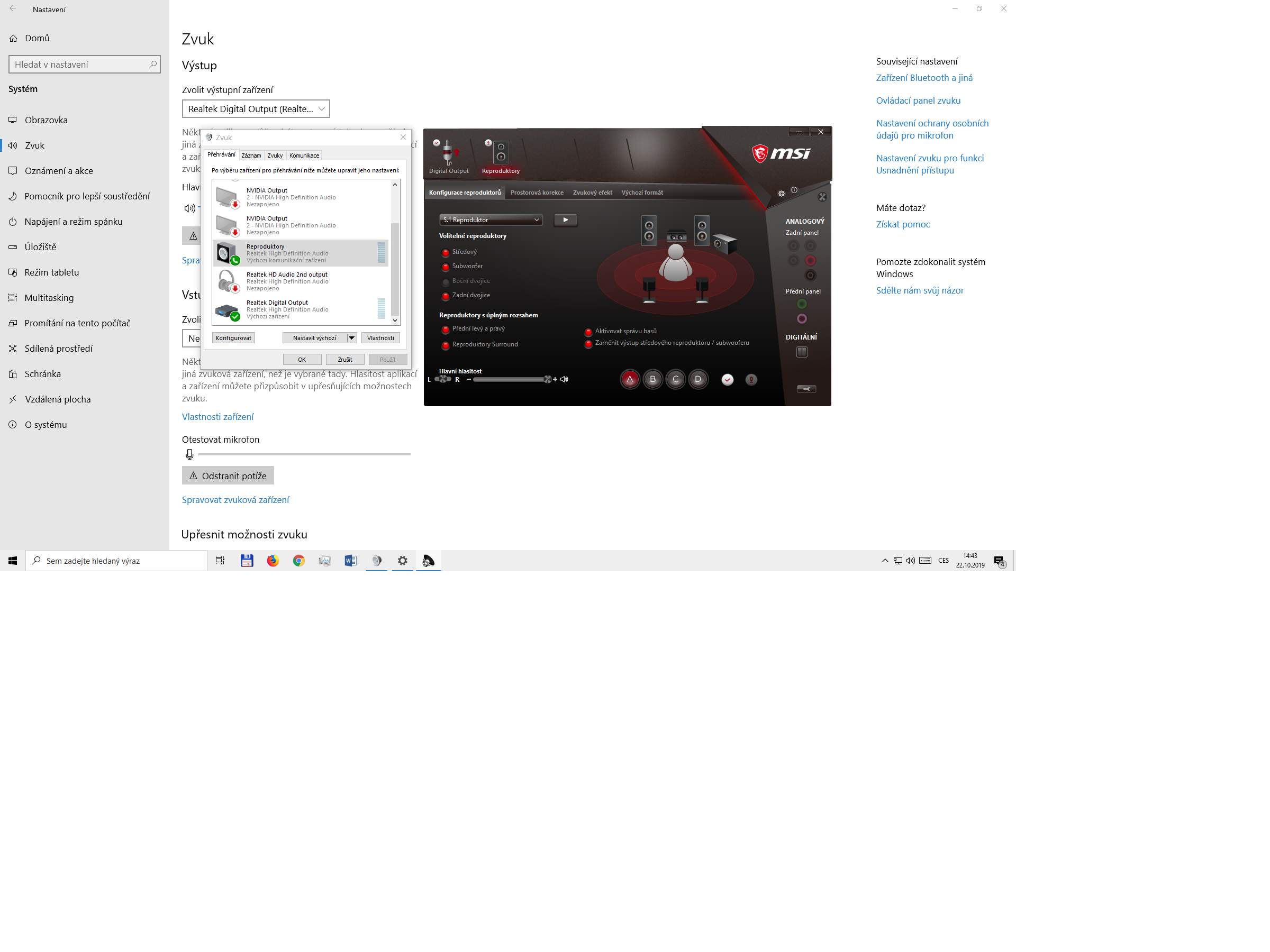 u výběru výstupního zařízení by mělo bejt zvoleno "Reproduktory (Realtek High Definition Audio)", tedy né nic z toho co vidim na screenech...
