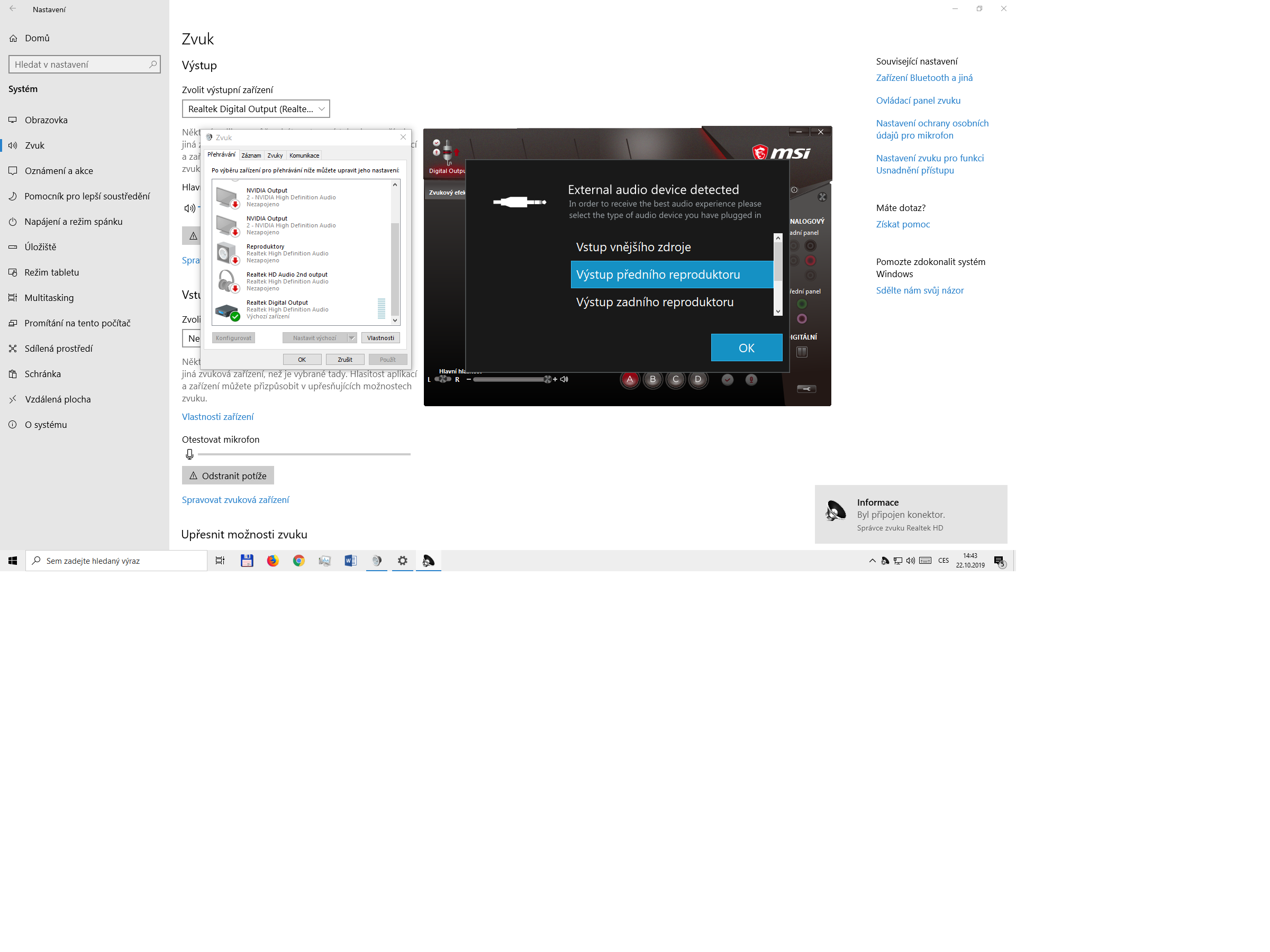 Abych popsal přesně problém, windows 10 ani přímo software pro MSI Realthek nenaleznou připojený jack, když ho dám do zdířky LINE OUT...když zapojím jack do jakékoliv jiné zdířky, systém zapojení rozpozná (i software MSI) a zeptá se, o jaký jde výstup (přední repro, subwoofer či centrem,...)...takže všechny zdířky kromě LINE OUT fungují... :-/