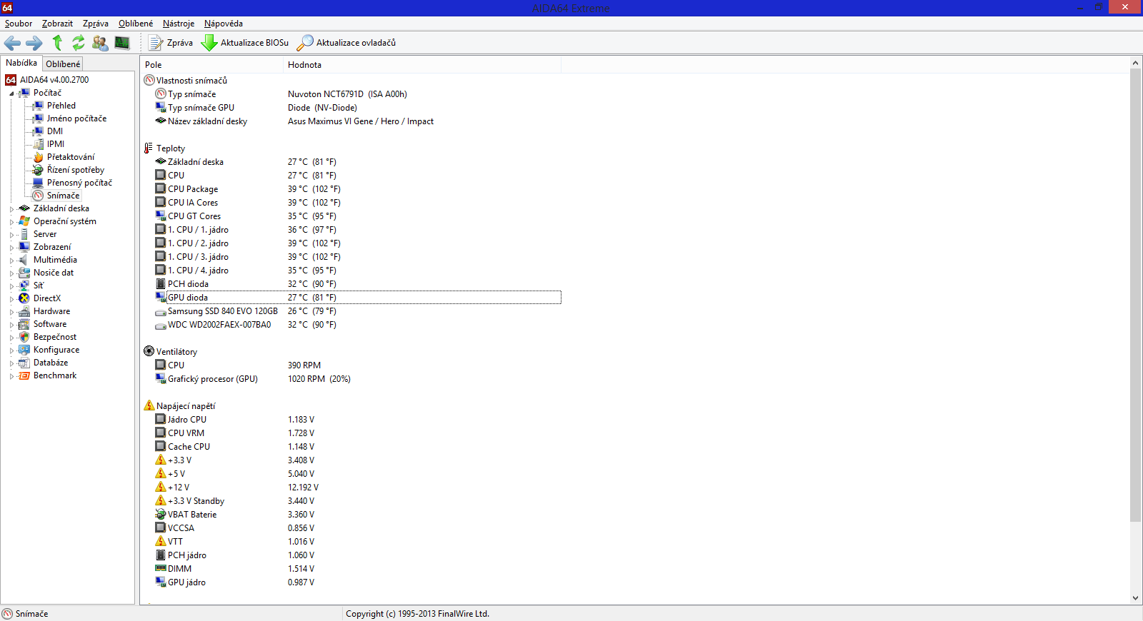 Ano, 29°C je výborná teplota ale v BIOSu a při otevřené bočnici. Jo, zapl bych hru :-D ale momentálně mám úplný čistý systém a Windows 8.1 nemá hodnocení výkonu. Zkusím nějaké benchmarky v AIDA64.