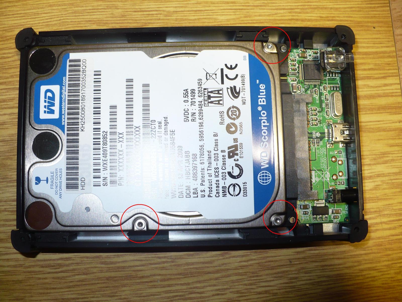 Zespodu budou 2 nebo 4 šroubky, které drží HDD na té destičce.