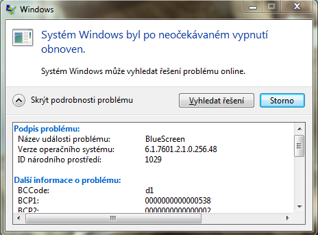 Takže, teď jsem se chtěl dívat na video, jenže se mi to začalo nějak sekat a i zobrazovat ta hláška, tak jsem ten ovladač přeinstaloval zpátky no a po chvíli se zobrazila BSOD. Potom se sám restartoval PC. Po naběhnutí systému mi vyskočila systémová hláška, která mi není vůbec cizí: