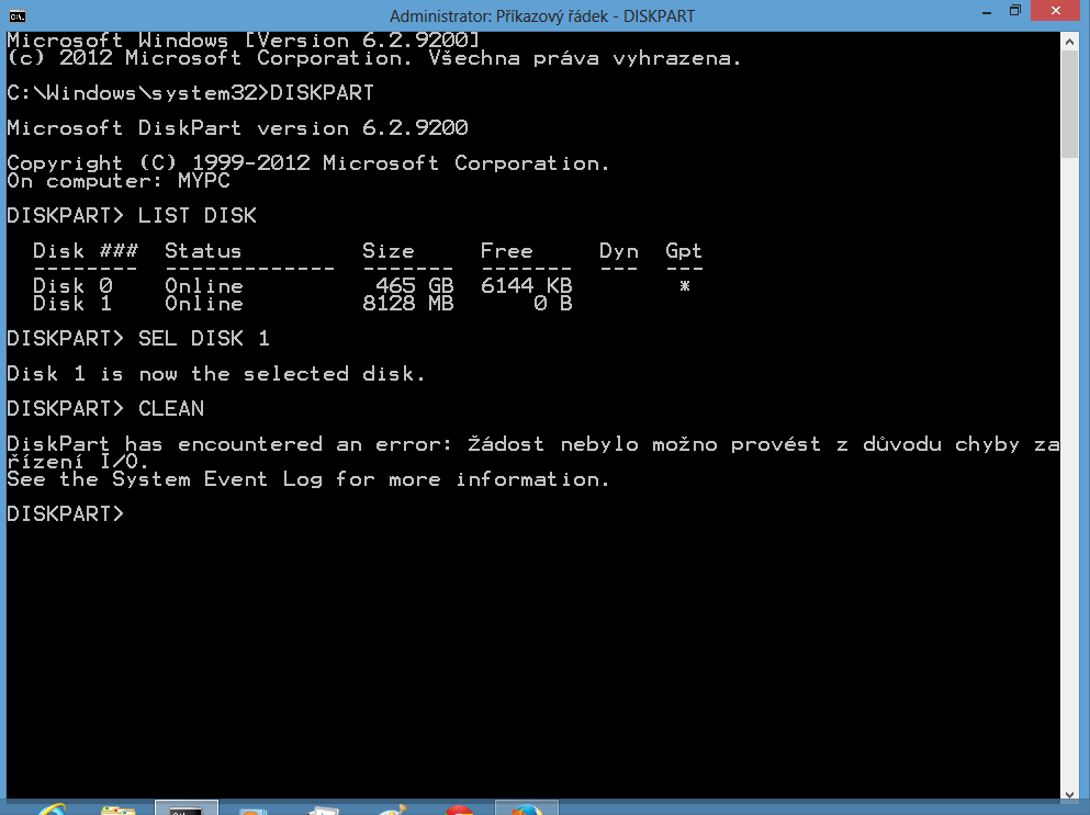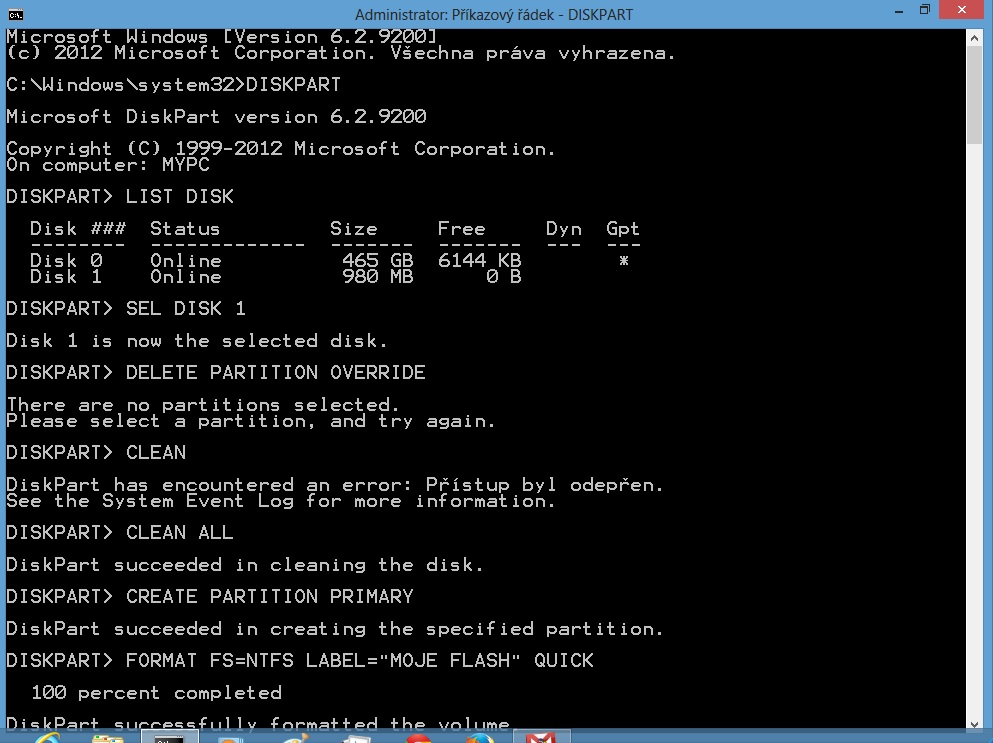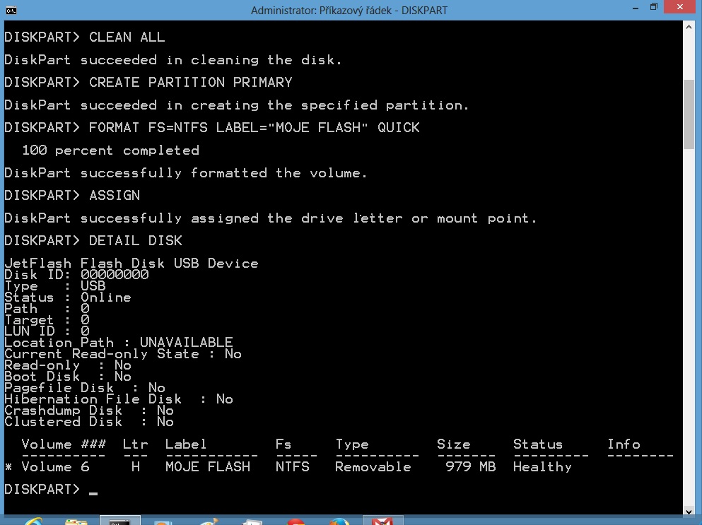 Nyní vyjměte flash disk bezpečně z USB, znova zasuňte a do příkazového řádku napište: