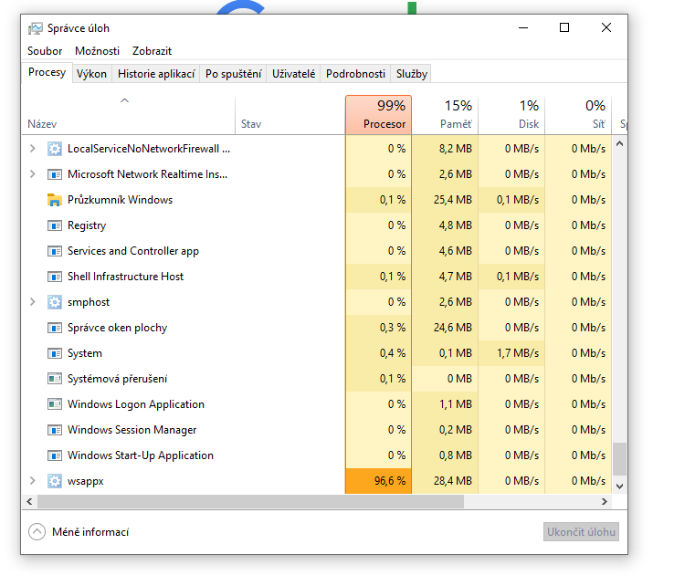 Procesor v tu chvílí jede na 99% - skoro všechno využívá wsapp