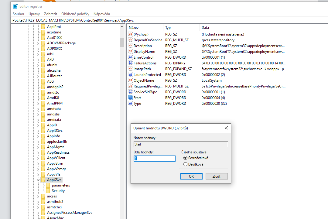 Po spuštění nouzového stavu: V ovládacích panelech store vůbec nevidím. Situace ve "službách" je pořád stejná, ClipSVC nejde zakázat.