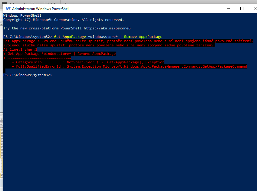 - v powershellu zadej příkaz: "Get-AppxPackage *windowsstore* | Remove-AppxPackage"