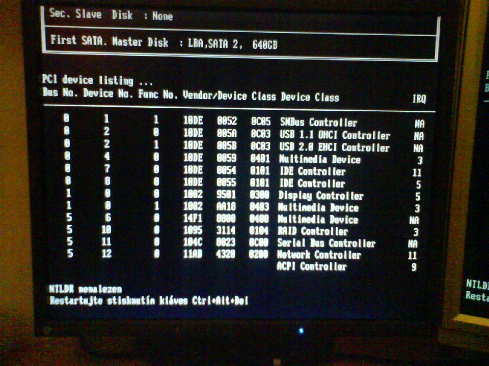 mám problém s … (nevím jestli to je HW nebo Win) při startu PC. Hrál jsme CoH 3 když se mi sekla hra a asi po 30s mi spadly Win do modrý smrti. Nic se nedělo a tak jsem zmáčknul rezet. Win naběhly, ale nešlo na nic kliknout, tak jsem je zase rezetoval. Při dalším zpuštění se mi objevila tato hláška Nenlezen NTLDR (viz příloha). Občas se mi to objevilo, ale vždy po rezetu se mi Win rozběhy naprosto v pohodě. Zkoušel jsme ještě vyměnit disk (mám dva, oba byli instalování na stejným PC, teď používám jen ten větší a druhý jako zálohu z Win), ale taky nic, hláška furt stejná. Mohly byste mi prosím poradit, kde je chyba. Zkoušel jsem prohledat fórum, ale nic jsem nenašel.