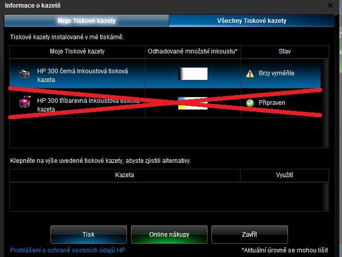 .Když se chci podívat, na stav (úroveň) objemu náplní, tak software mi ukáže jen černou, barevná jakoby tam vůbec nebyla. Prostě ji nedokáže detekovat.