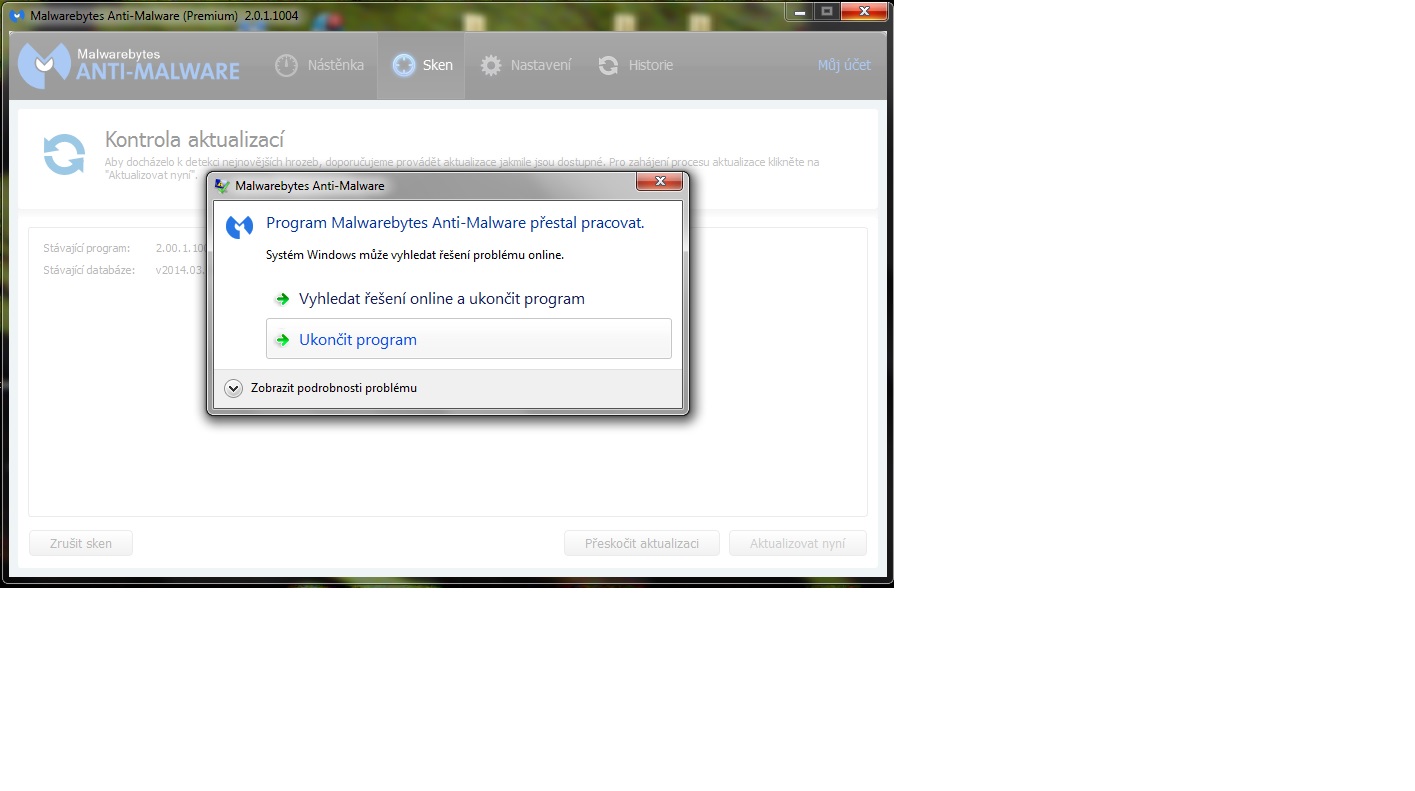 Kdyz jsem pred nedavnem aktualizoval MbAM po reinstalaci se ukazala tabulka menu a v nem ze je potreba zauktualizovat program. ale kdyz dam na aktualizaci MbAM tak vyskoci : ukoncit ulohu a vse prestane... a MbAM nejevi znamky spusteni.