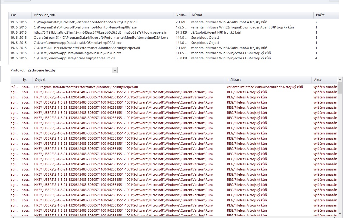 Asi už 3 dny mi Eset stále opakuje tyto hrozby a infiltrace -> horní je z karantény a dolní z protokolů. Jednu infiltraci mi opakoval 100x.