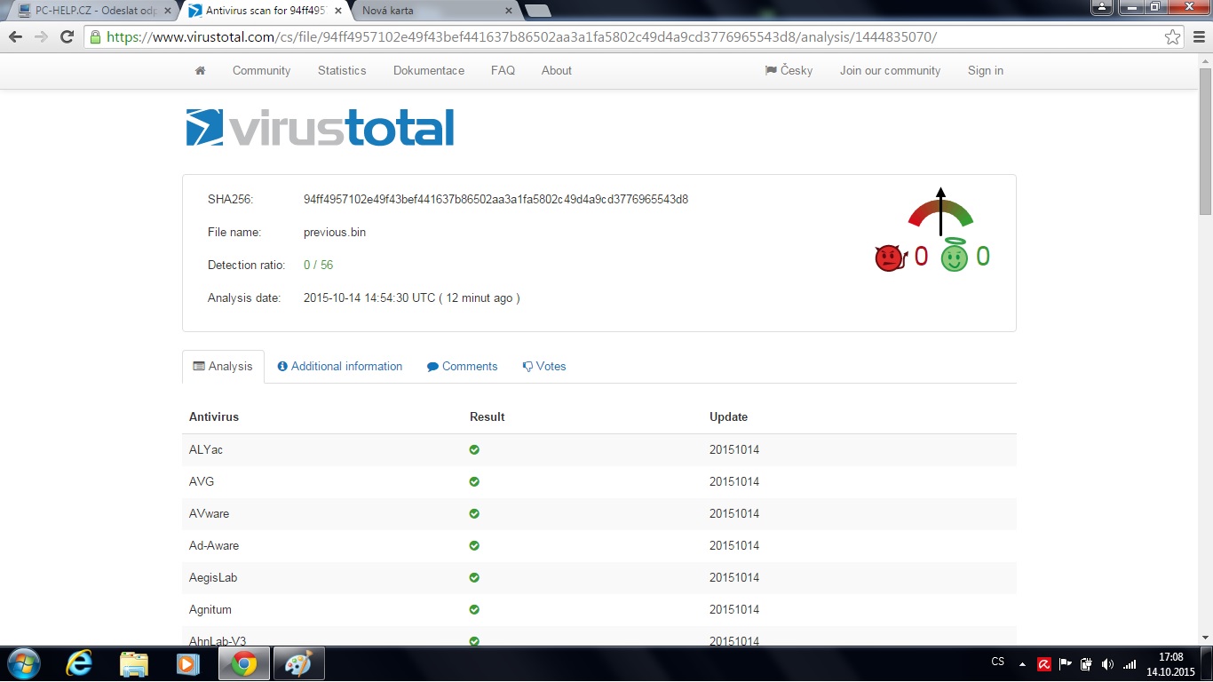 Klikni vpravo od okénka na Vybrat a v Exploreru najdi požadovaný soubor v Tvém PC. Označ ho myší a klikni na Otevřít , poté klikni na Send File. Pokud už byl soubor testován , objeví se okno ve kterém klikni na Reanalyze. Soubor se začne postupně testovat více antivirovými programy. Až skončí test posledního antiviru , objeví se nahoře result a červeně počet nákaz , např. 0/43 , nebo 1/43. Pak zkopíruj myší odkaz na tuto stránku a vlož ji do svého příspěvku.