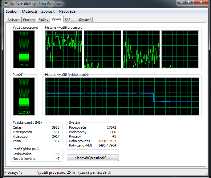 Zdravím, prosím o kontrolu logu. Nedávno jsem měl stejnej problém se starým HDD myslel jsem že je to ním proto jsem si pořídil nový, čistě naistaloval W7 šlapalo to krásně využití cpu a ram bylo neznatelné, po aktualizacích (220+) snížení výkonu, využití ram a CPU se rapidně zvedlo, snížila se i rychlost internetu. Ram a CPU jsou nanejvíc 2 roky staré. Při sledování Youtube, zamrzává a dlouho se načítá. Předem děkuji za případné rady ke zvýšení výkonu, rychlosti a snížení využití ram a CPU. Přikládám i screenshoty ze správce úloh hned po cca 30min zapnutém PC,Log z HJT a screnshot z ADSL měření rychlosti.