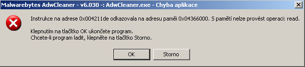 AdwCleaner opět vyhodil chybu, tentokrát jsem udělal i screen. Když jsem klikl na OK, tak se program zavřel