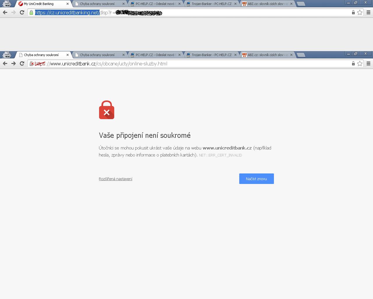 Útočníci se mohou pokusit ukrást vaše údaje na webu http://www.unicreditbank.cz (například hesla, zprávy nebo informace o platebních kartách). NET::ERR_CERT_INVALID