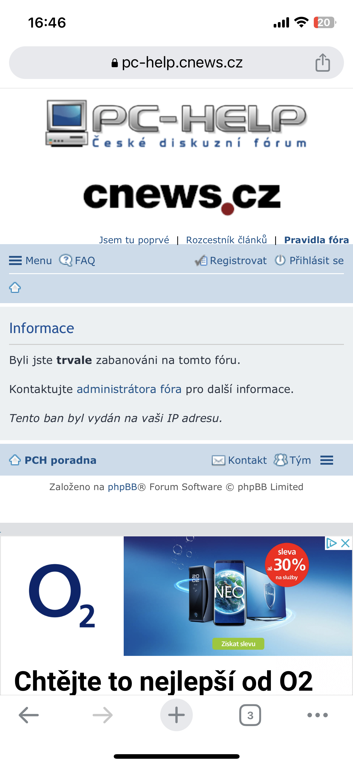 Používám Google Chrome a na PC-Help se připojuji furt stejně. Tuto hlášku mi to napsalo v pátek, když jsem chtěl řešit problém s notebookem. Zkusil jsem to v práci a tam to šlo. Dnes doma opět trvalý ban na IP. Píšu z mobilu přes data.