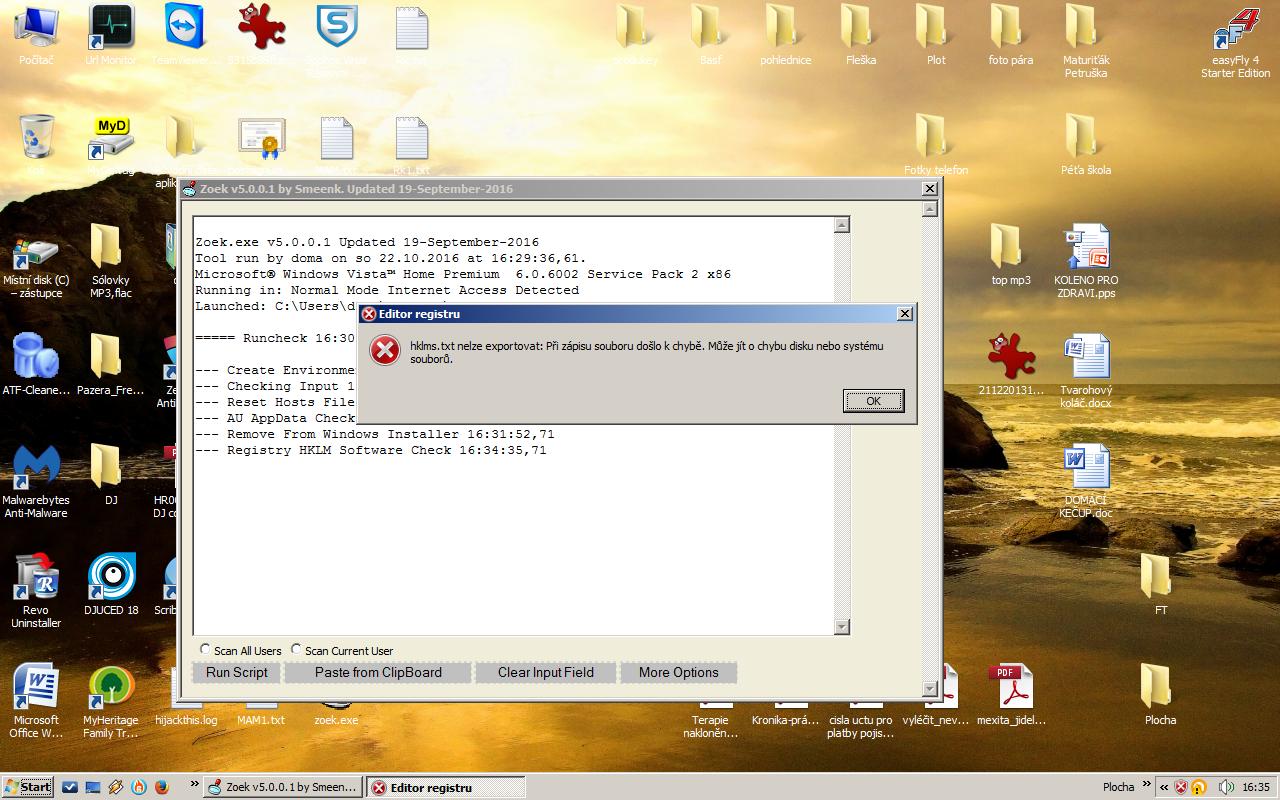 - po proběhnutí programu se ti objeví hláška tak klikni na „Vše do karantény(smazat vybrané)“ a na „Exportovat záznam“ a vyber „textový soubor“ , soubor nějak pojmenuj a někam ho ulož. Zkopíruj se celý obsah toho logu.