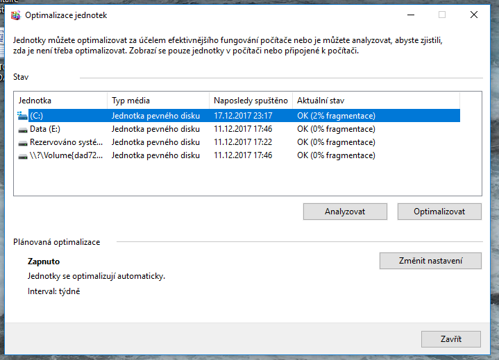 Defragmentace je asi zbytečná, nastavena na automaticky (screen).