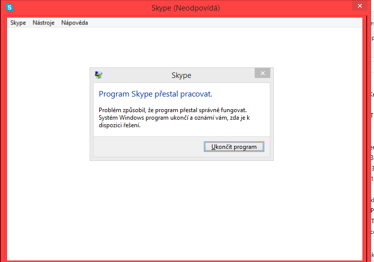 Zdravím, zničeho nic mi přestal fungovat Skype. Když ho chci zpustit, tak hned mi napíše že Program Skype přestal pracovat.,,Ukončit program"