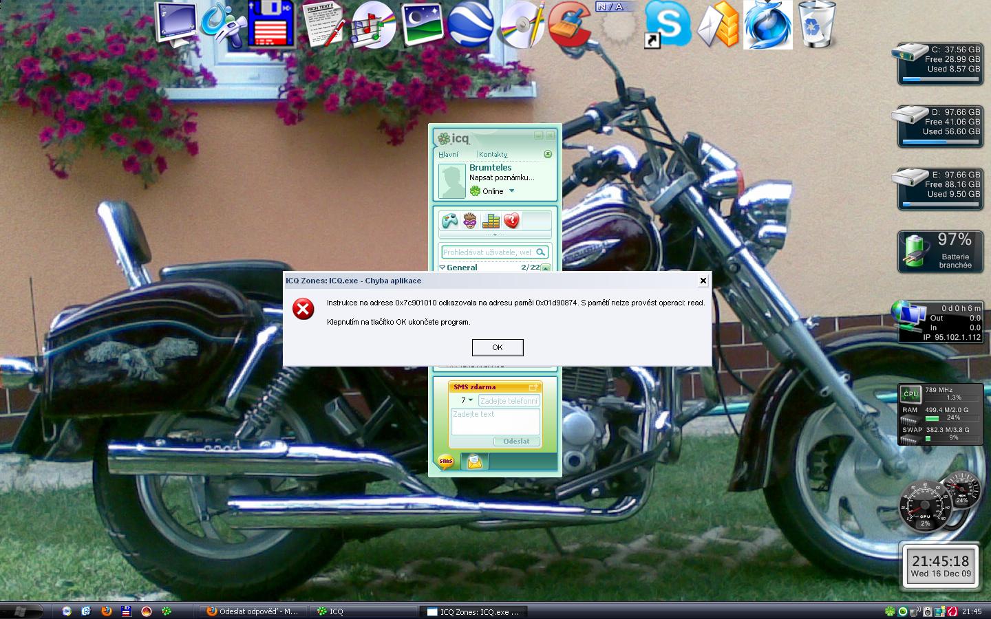 Spustil som memtest a všetko je OK. Nainstaloval som Javu, Net Framework, Microsoft Visual C++, Windows instaler a stále je to to isté. Icq sa spustí a asi po 10-15 sekundách nabehne tá hláška z prvého screenu. Po jej odkliknutí naskočí tá druhá a po nej sa icq ukončí. Už neviem čo stým.