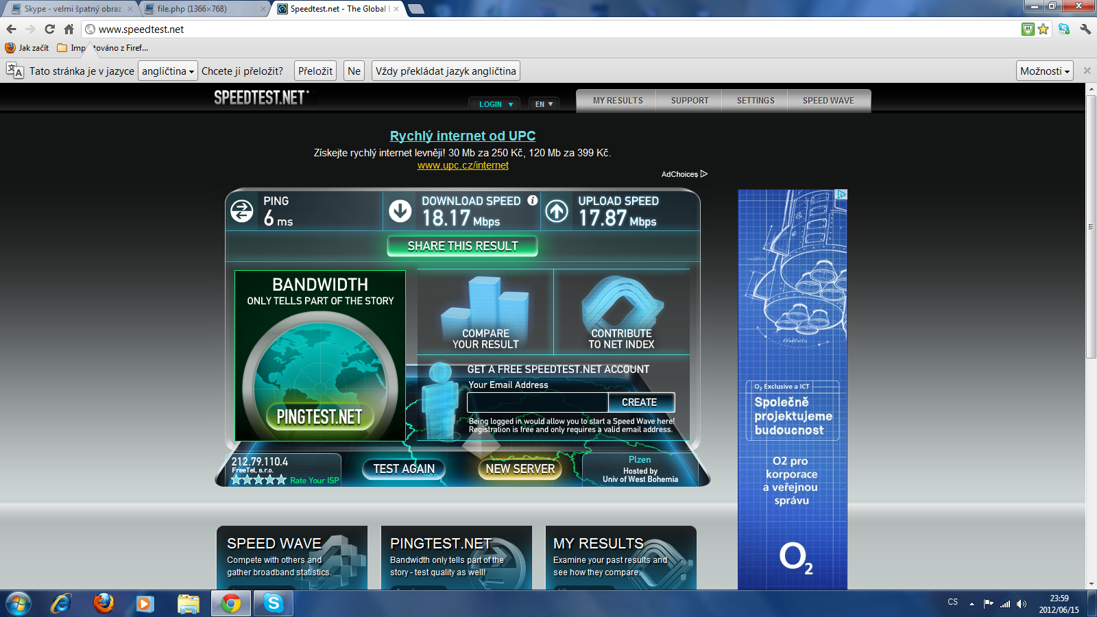 Zdravím, mám veliké potíže se skypem. Volám si s kámošem a špatně se vidíme i slyšíme. Bydlíme od sebe pár metrů. Kamarád má download: 21mb/s upload: 20mb/s 5ms. A já 92mb/s a upload: 70mb/s 1ms (měřeno na http://www.speedtest.net). Máme oba dva internet od Pilsfree. Spojení mezi námi dvěma je příšerné - kvalita obrazu je nekoukatenlá jak je rozmazaná a i se kolikrát stane, že si navzájem rozumíme každé třetí slovo a ještě to třeba úplně vypadne... Ale když jeden z nás (je buřt kdo) volá kamarádce třeba do Prahy, kde je UPC s rychlostí download 10mb/s a uploadem: 1mb/s Ping: 15ms. Tak to jede v pohodě v HD. Jak já, tak kámoš. :-(
