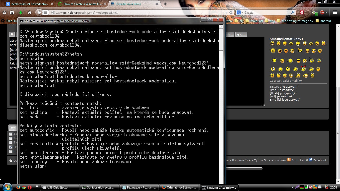 netsh wlan set hostednetwork mode=allow ssid=GeeksAndTweaks.com key=abcd1234problém nastvává že se to zasekne u