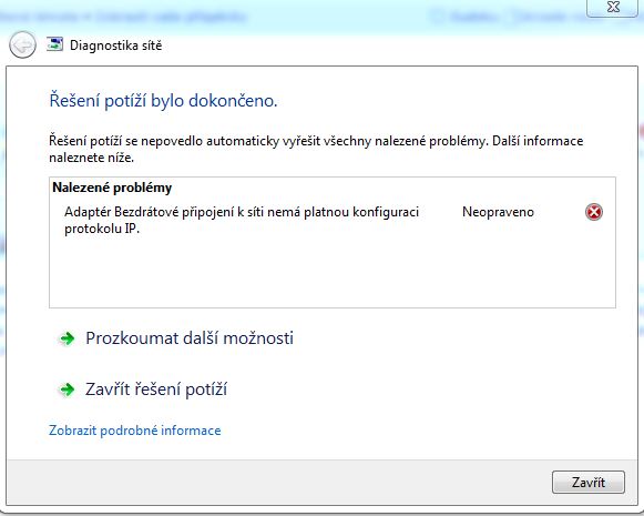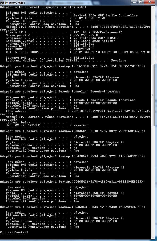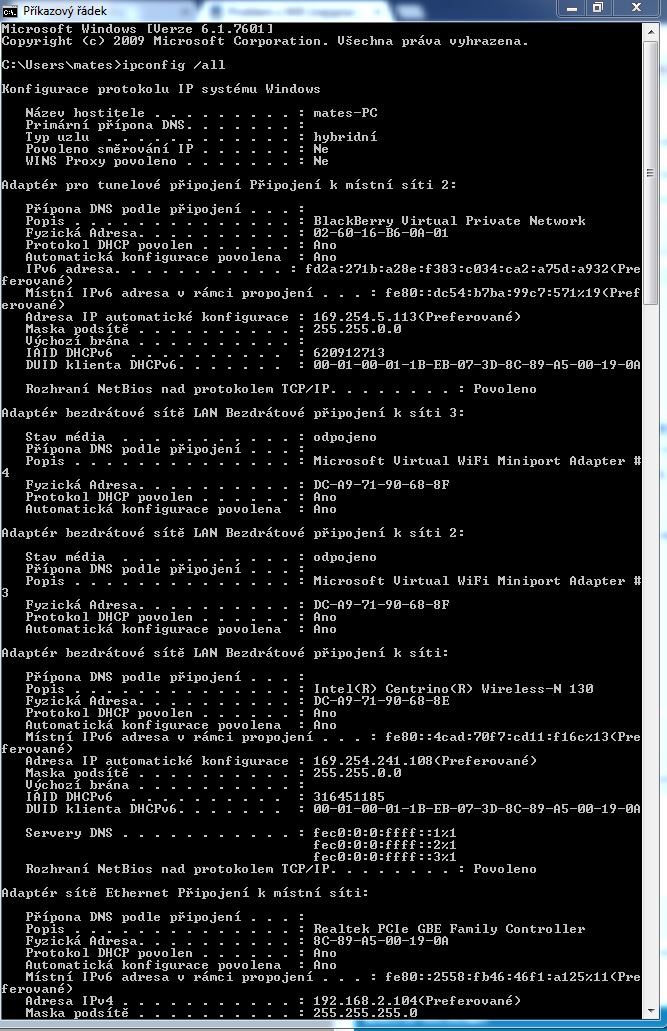 Hezké. Jenže nic neříkající. Potřebuji ipconfig té nefunkční, tedy bezdrátové sítě. Takhle tam akorát uvidím, že jsi připojen přes LAN.