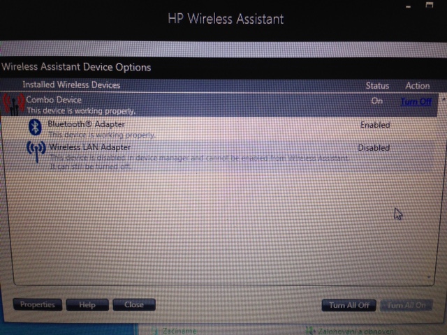 HP Wireless Assistant - Properties - co je tam jako posledni volba?