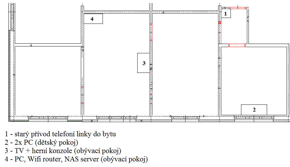 4. port routeru (LAN) povede do dětského pokoje, bod 2, zde bude switch a do něj 2xPC.