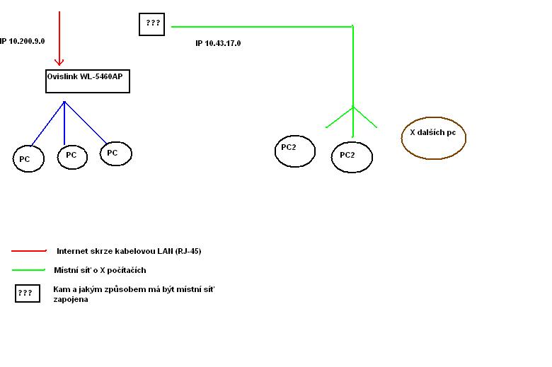 Pro lepší ilustraci jsem se pokusil připojit nákres.Červená je síť poskytovatele netu, zelená je zmíněná místní síť, přičemž nutně potřebuji mít spojení jak s internetem (u všech 3 PC propojených modře s AP od Ovislinku), tak se zelenou sítí (stačí pouze jeden modře spojený PC se dvěma znázorněnými PC2). Navíc bych nějakým způsobem rád zakázal uživatelům ze skupiny PC2 přístup na internet prostřednictvím mého připojení.