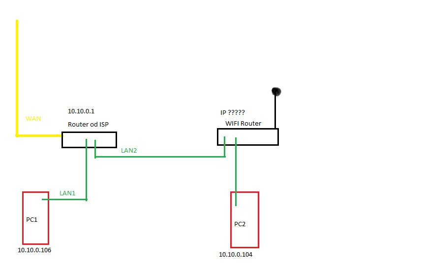 Dosud jsem používal rozvod sítě pomocí UTP kabelu z jednoho Routeru (klasický drátový TP-Link) dodaného mým ISP do kterého bohužel nemám přístup, kdy zajištoval připojení dvou PC k internetu. Nyní ale syn chce wifi aby mohl používat tablet takže jsem koupil druhý router s wifi který jsem dal do synova pokoje a je stále zapnutý.